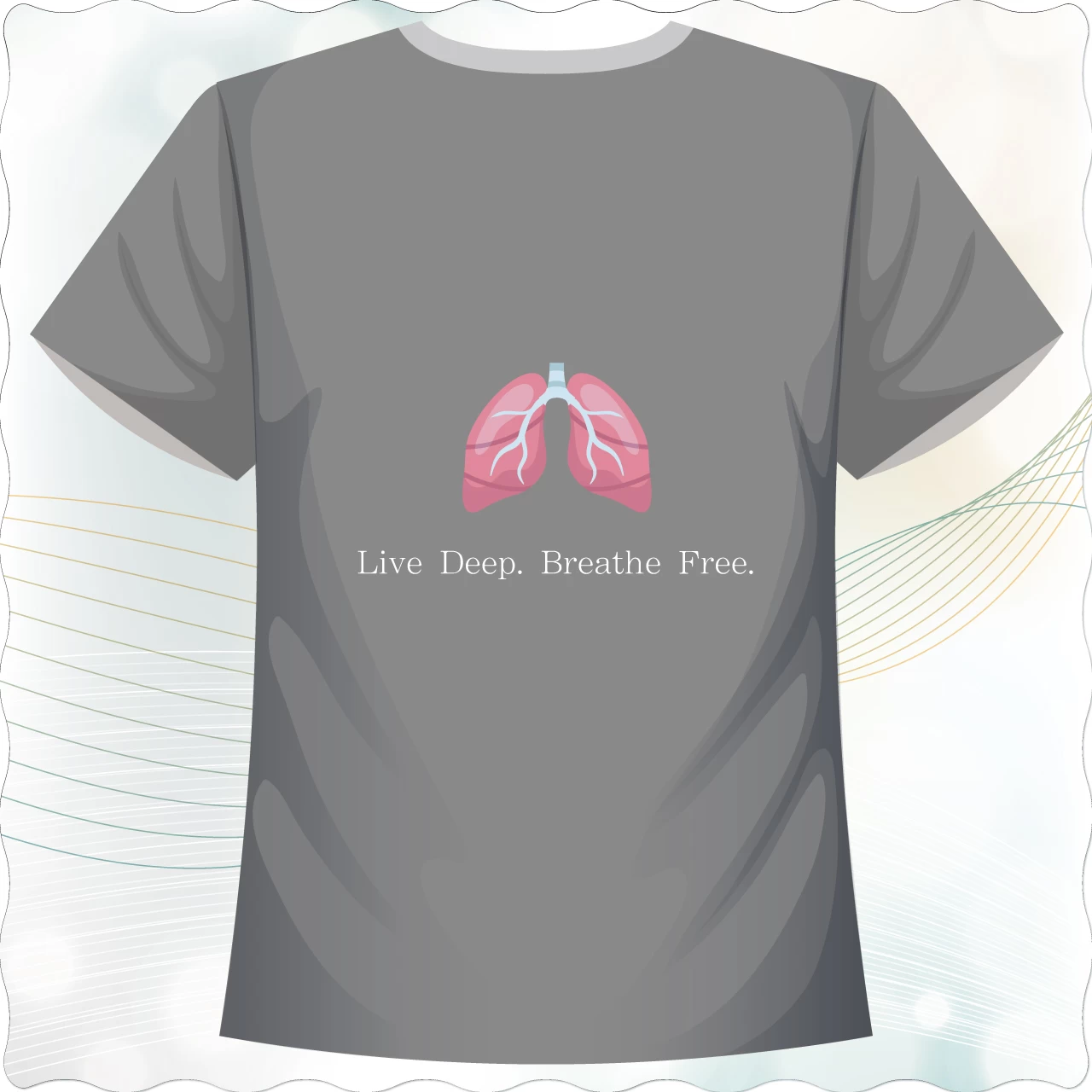 前側以解剖風格呈現的紅色心臟圖騰為主視覺,搭配標語「Keep Beating. Keep Living.」,象徵心跳是生命的節奏。背面則以粉紅肺部圖像呈現,搭配標語「Live Deep. Breathe Free.」,傳達深呼吸所帶來的自由與平靜。