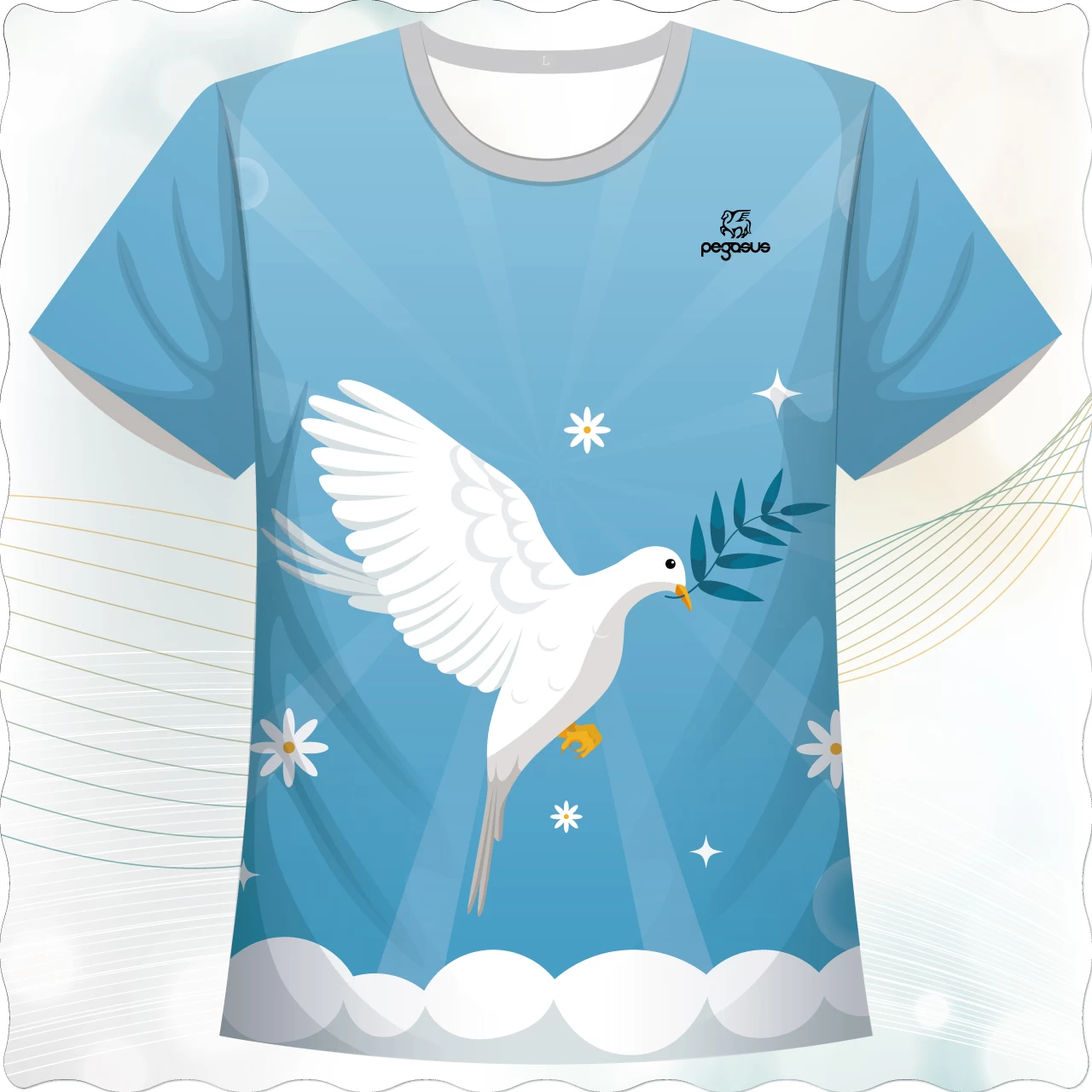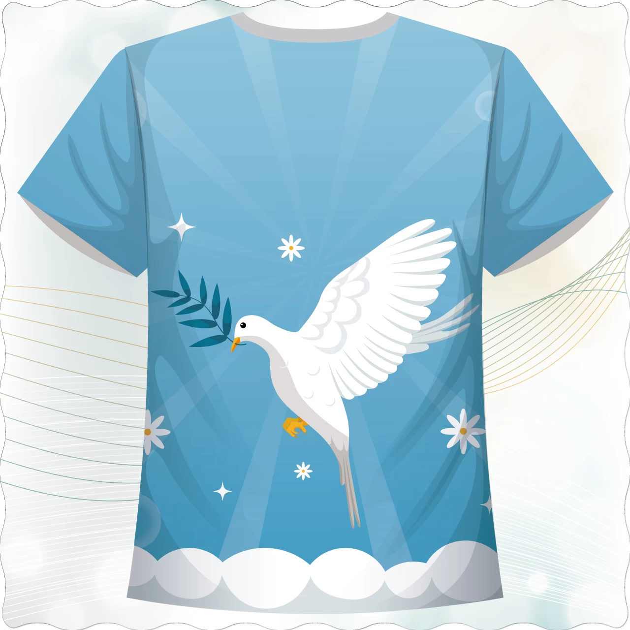 「和平之翼款」,晴空藍作為基底,正反面皆印上展翅飛翔的白鴿,口銜橄欖枝,周圍點綴白雛菊與星光,象徵純潔、希望與和平。柔和的雲朵底紋與放射光暈讓整體畫面更顯溫暖柔亮,營造出一種寧靜安詳與正向力量的氛圍。