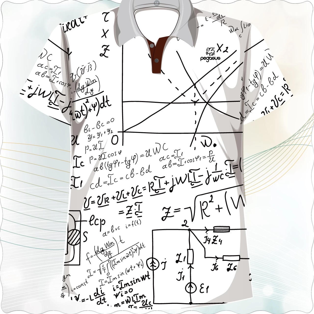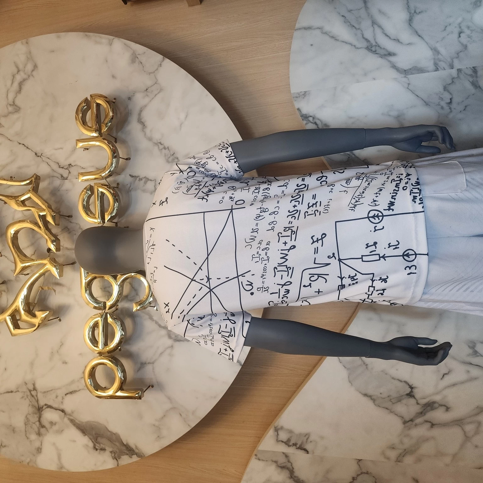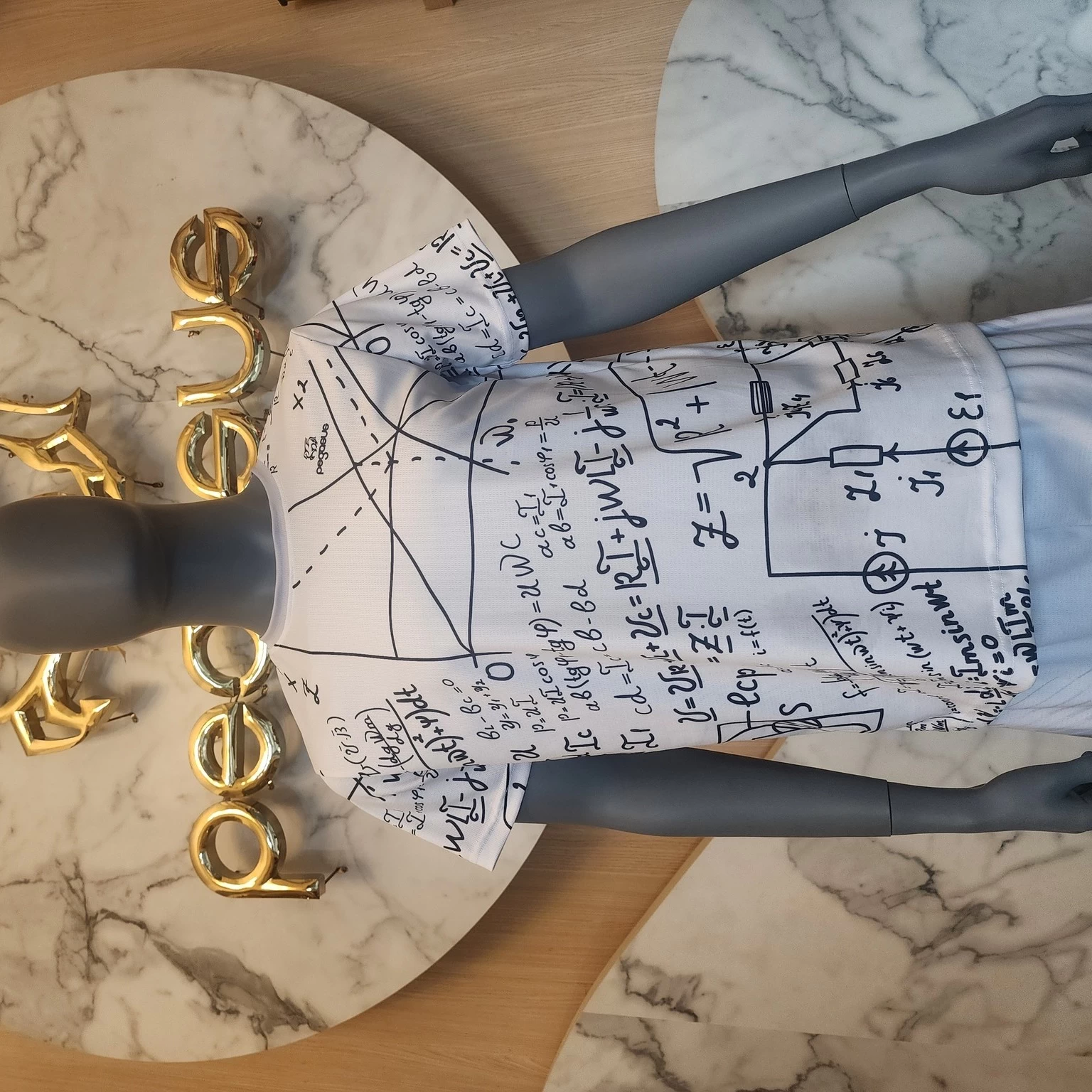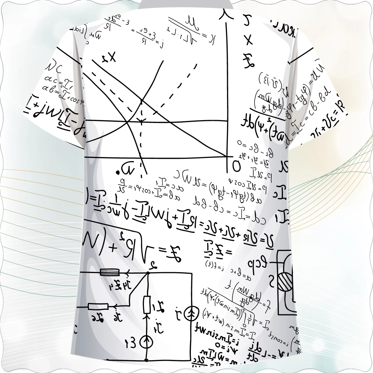 這件T-shirt以白色為底,全面印有黑色手寫風格的數學公式與幾何圖形,呈現出學術氛圍與創意感。設計如同數學筆記般隨意且豐富,讓整體看起來充滿智慧與趣味。袖子與主體圖案連貫一致,視覺效果和諧統一。