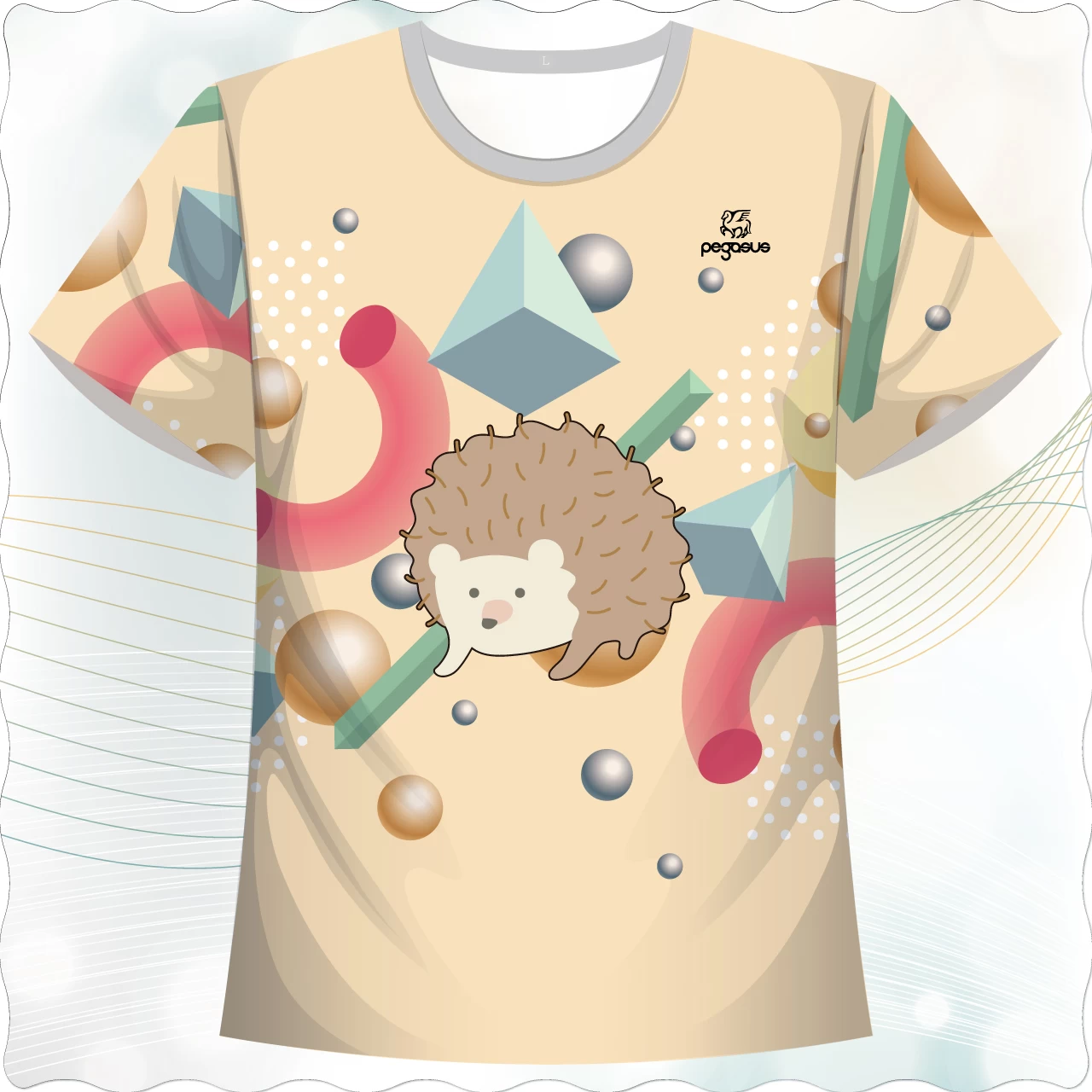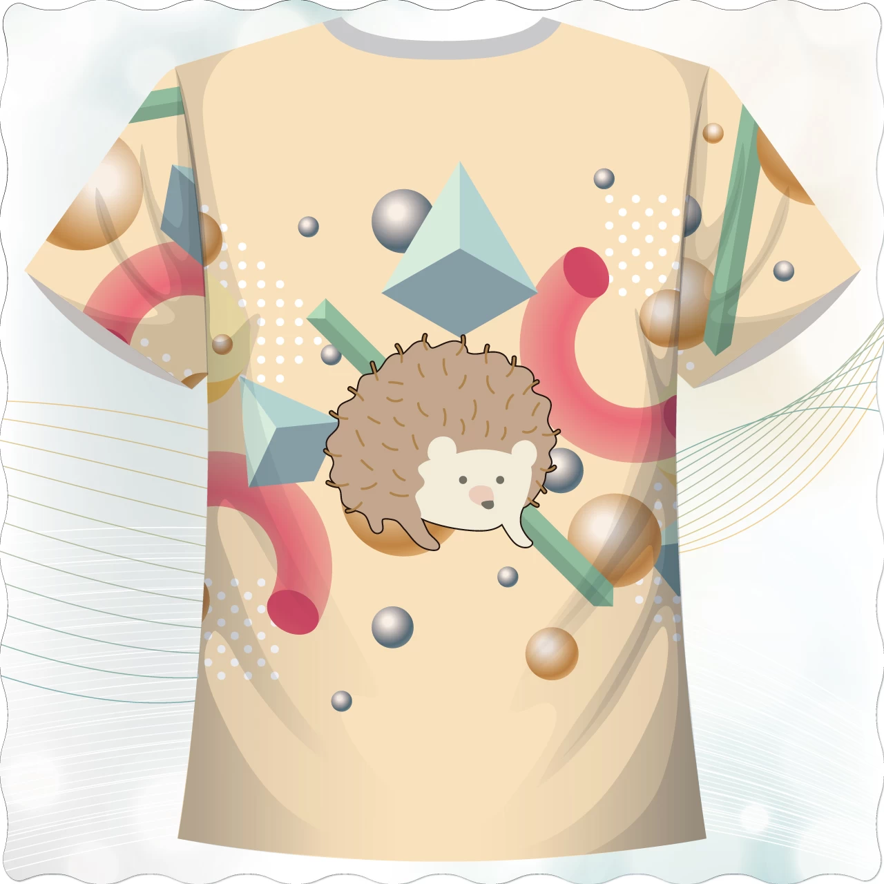 「幾何小刺球款」,以療癒系刺蝟為主角,結合立體幾何圖形與金屬質感元素,營造出童趣與潮流並存的視覺感。背景運用圓球、立方體、圓弧等抽象幾何元素錯落排布,並搭配漸層與陰影效果,讓整體畫面更具立體感與層次感。刺蝟位於設計核心,柔和的色彩與可愛的造型,為整體增添溫暖與親和力。此設計非常適合喜歡可愛風格、幾何藝術與個性化穿搭的族群,無論是日常休閒、外出旅遊或是送禮都相當百搭。