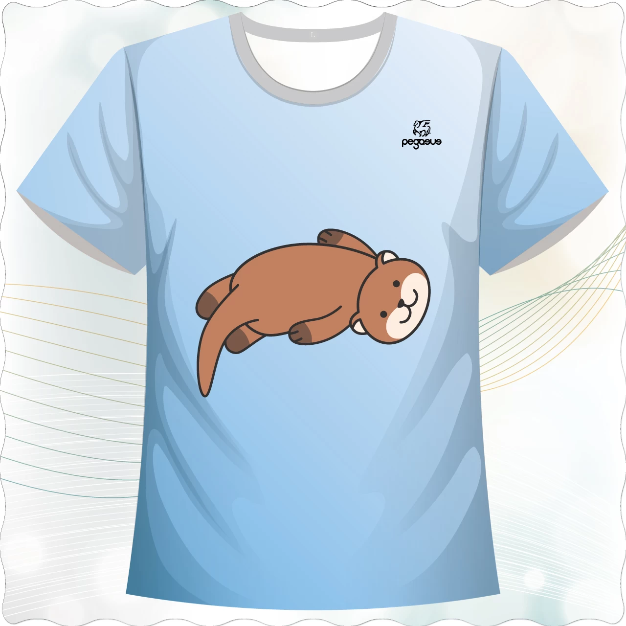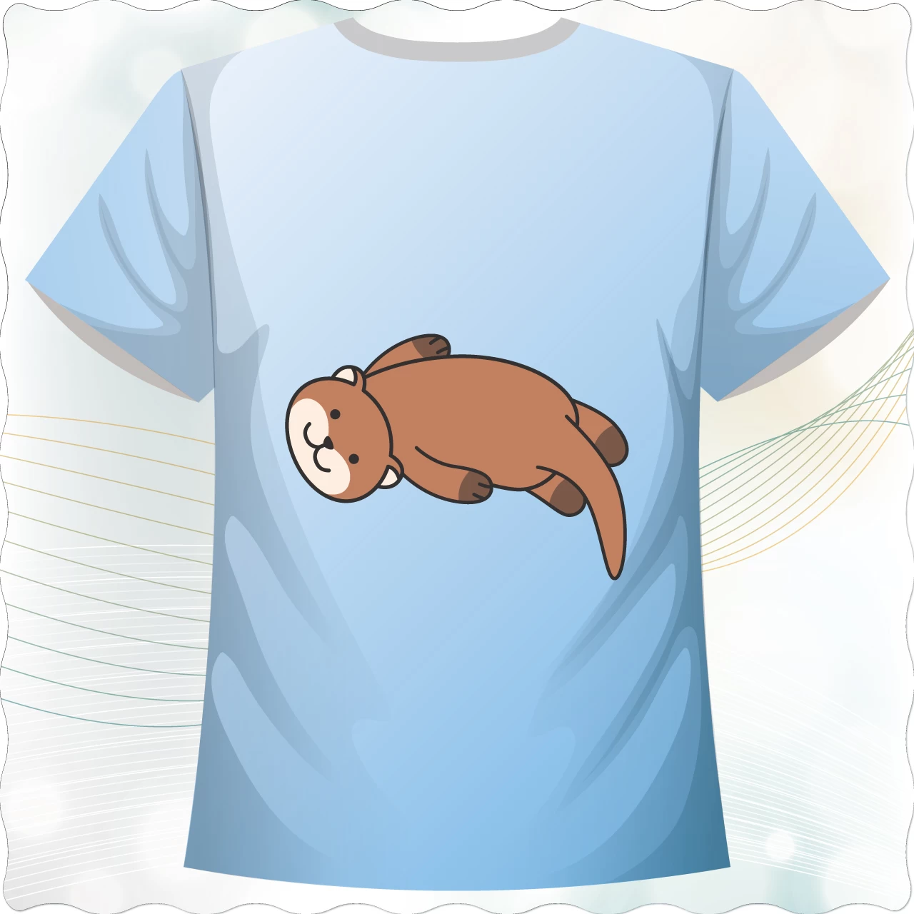 「悠游時光款」,以悠閒水獺為主角,採用淡藍色漸層底色,帶來清爽舒心的視覺感受。小水獺呈現慵懶地漂浮姿態,療癒的表情搭配柔和線條,傳遞出輕鬆無壓的氛圍,非常適合親子裝、情侶裝或喜愛小動物的族群穿著。整體風格簡潔俐落卻不失童趣,是一款兼具可愛感與穿搭實用性的客製化T恤。