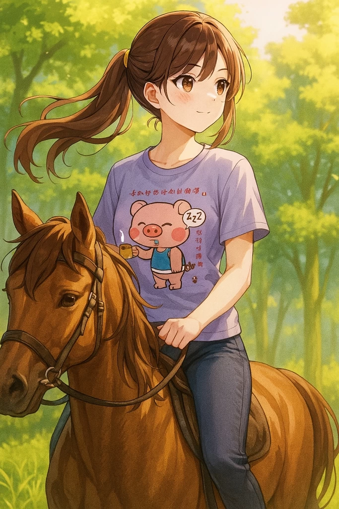 這件T-shirt以柔和的紫色為底色,領口使用鮮明的橘色滾邊,增添活潑感。正中央印有一隻可愛的粉紅色卡通豬,戴著藍色圍裙,手持一杯熱咖啡。豬的上方有中文文字,增加趣味與親切感。整體設計輕鬆幽默,充滿生活氣息與童趣。