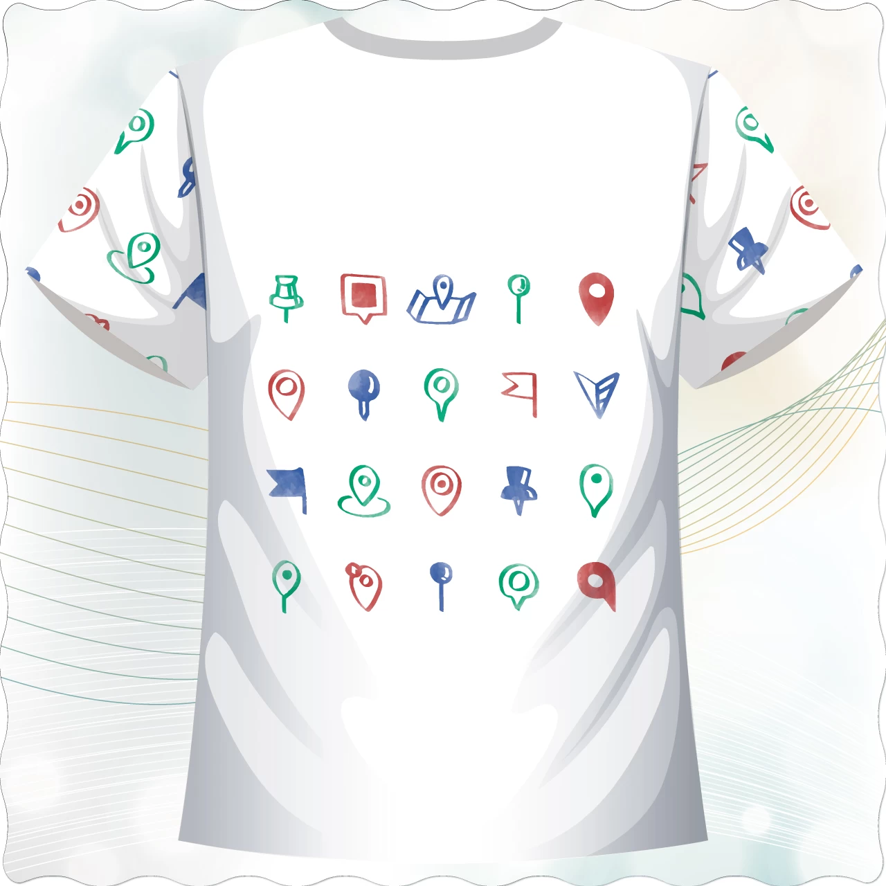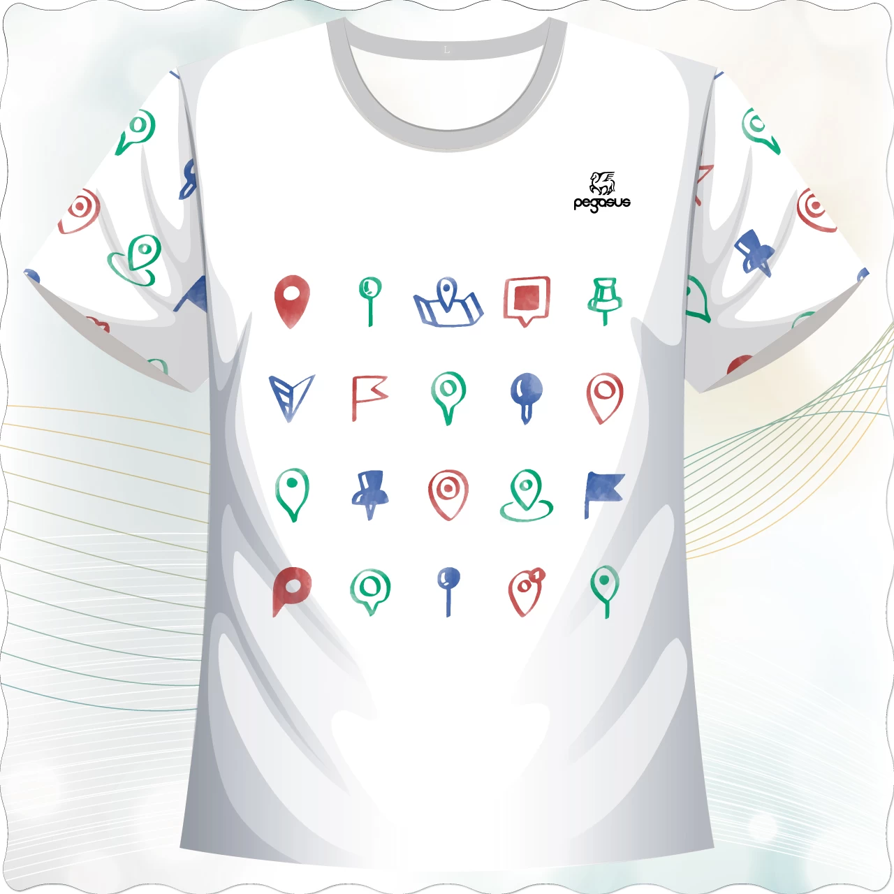 「探索座標款」,展現了「定位感」與「探索感」的設計概念。整體以白色為底,搭配 紅、綠、藍三色的地圖定位符號圖案,以水彩筆觸般的風格呈現,讓整件T-shirt既俏皮又充滿科技感。定位圖標不僅排列在正反面,也延伸至衣袖,營造出 滿版設計的豐富視覺效果。