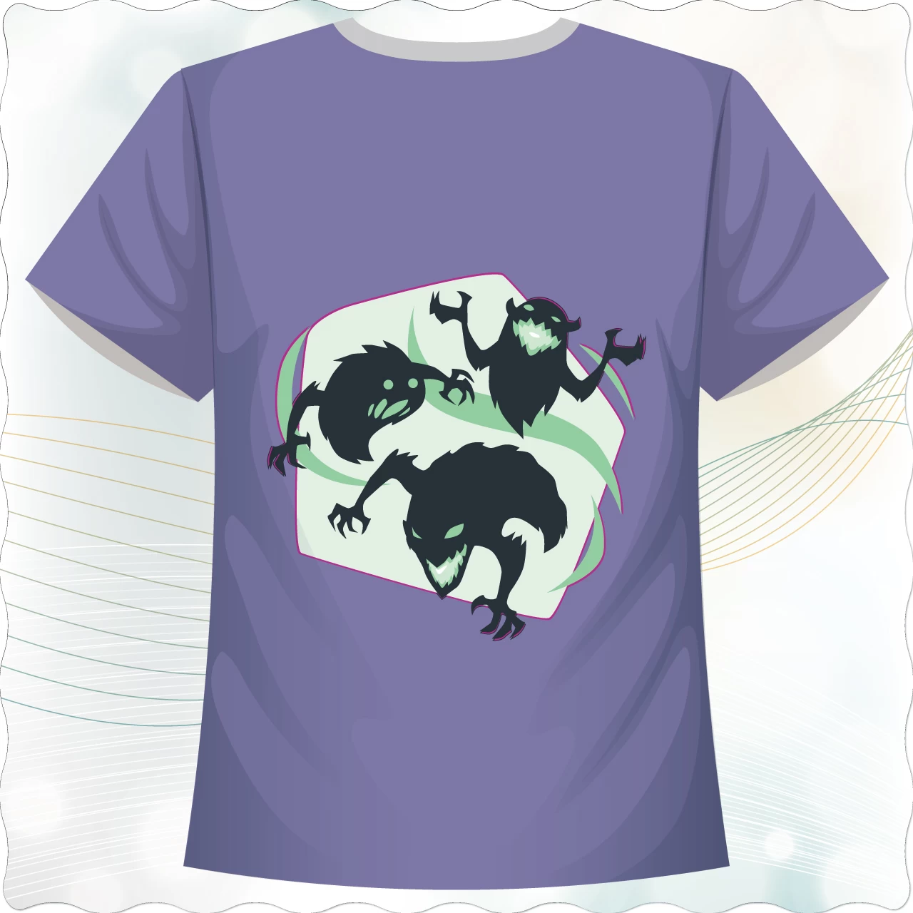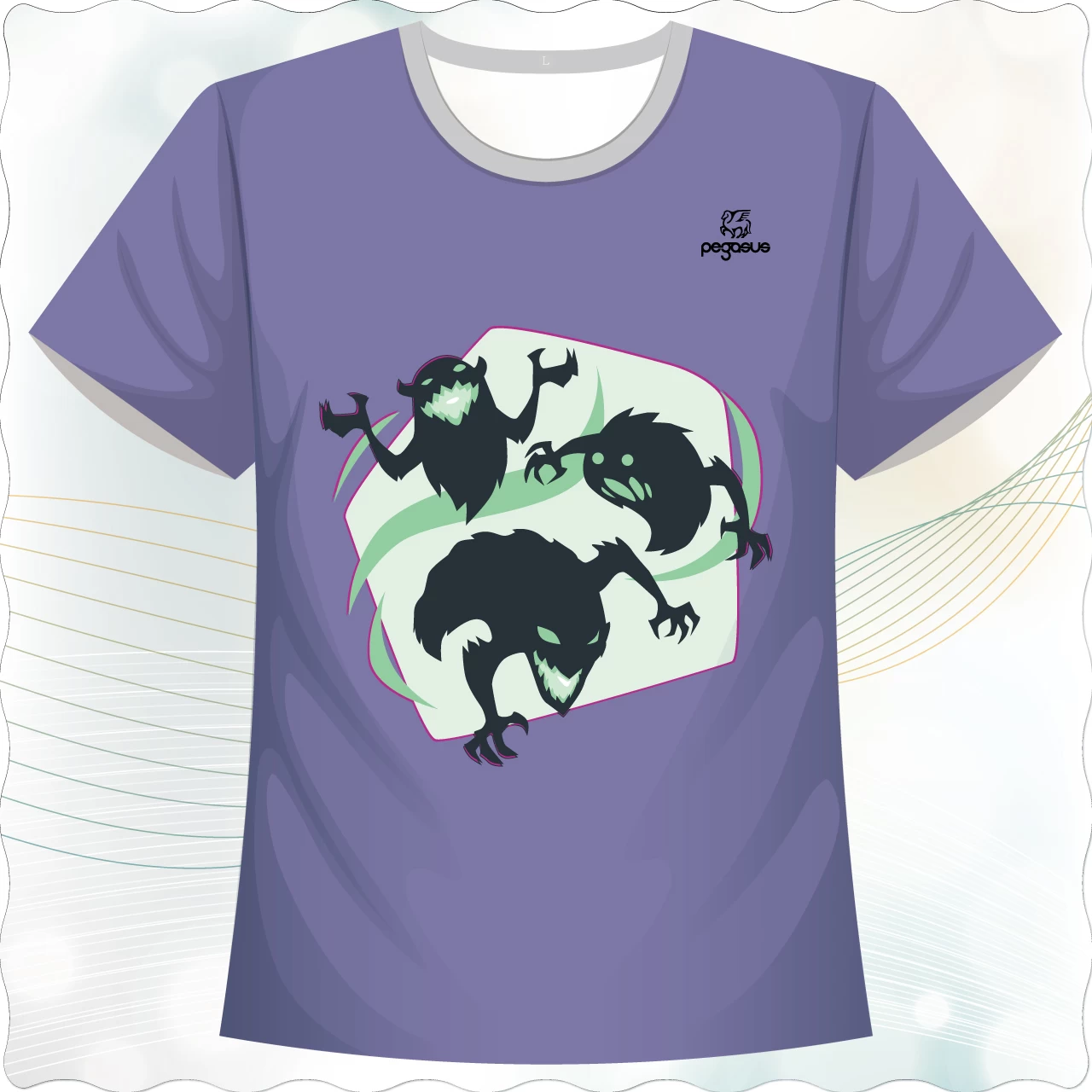 「暗影獵者款」以深紫色為主色調,結合冷冽的螢光綠與黑色剪影,呈現三個充滿張力的暗影生物形象,散發神秘與危險氣息。圖案以流線型的光影框架包覆,營造出如同穿越異世界的氛圍。此設計適合喜愛奇幻、暗黑或遊戲風格的族群,無論是動漫展、電玩派對或街頭穿搭,都能成為眾人目光焦點。