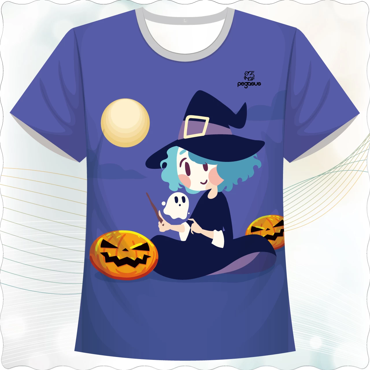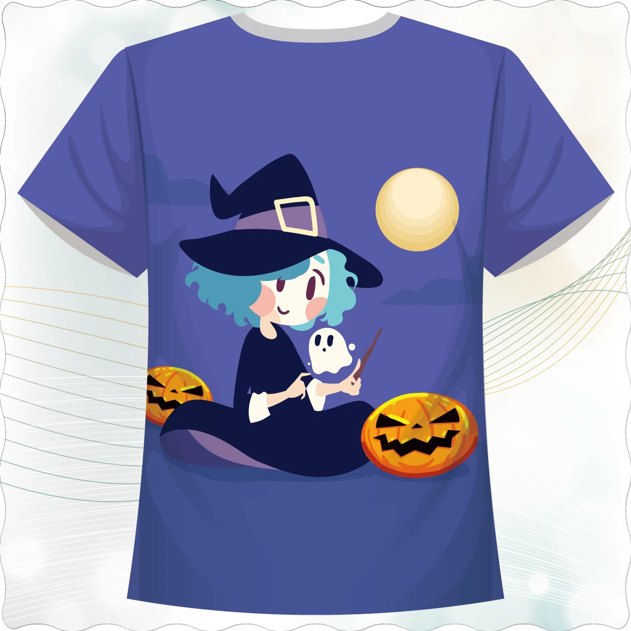 「月夜魔法款」,以深藍色為基底,營造出神秘的夜空氛圍。主視覺是一位頭髮帶有夢幻藍綠色的可愛小女巫,手持魔杖與小幽靈相伴,身旁點綴著南瓜燈與滿月,散發濃厚的萬聖節氣息。整體風格結合了童趣插畫與節慶元素,不僅保有萬聖的神秘氛圍,又帶著溫馨可愛的氛圍,讓穿著者無論在派對或日常搭配都能展現獨特魅力。此設計特別適合親子裝、萬聖節活動制服,或是喜歡節慶氛圍的個人客製需求。