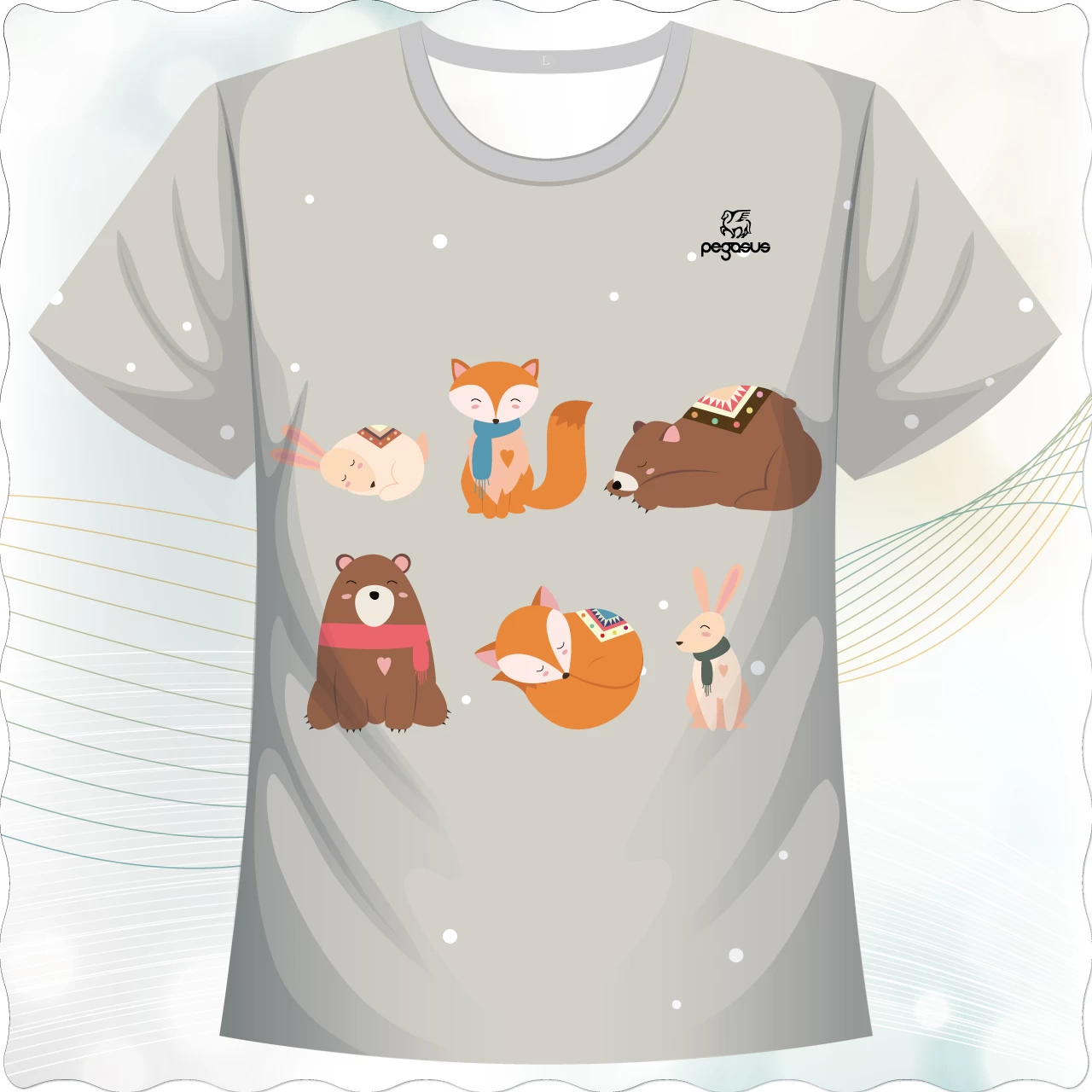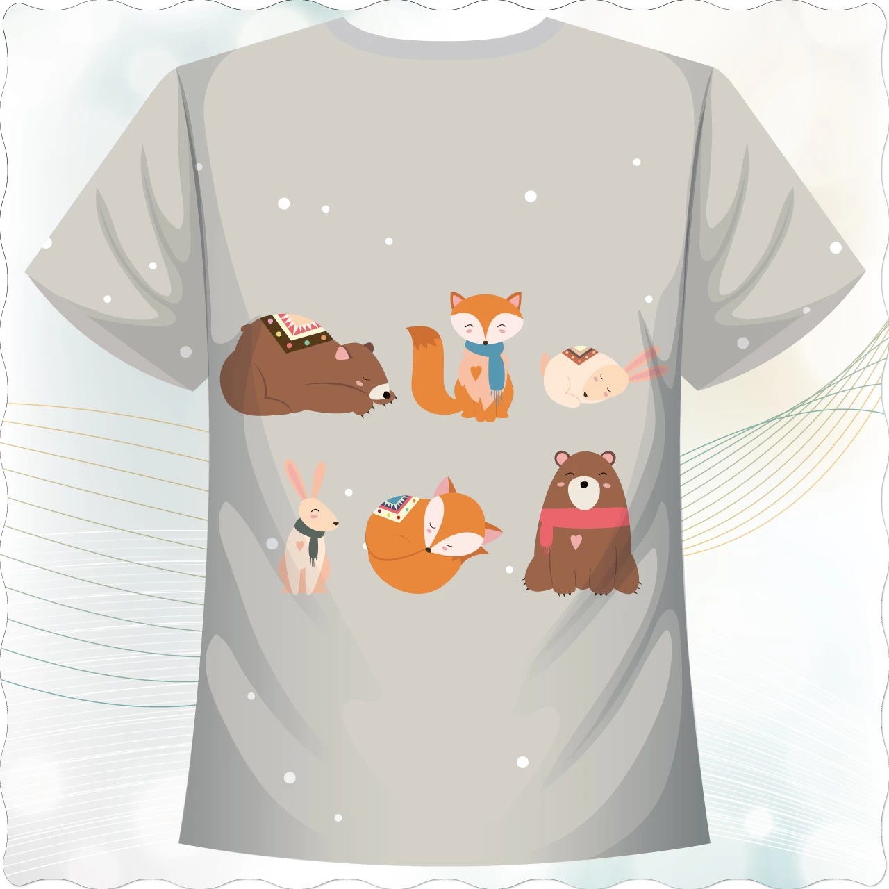 「森林暖眠款」,以 灰色底布 搭配多隻可愛的小動物插畫,營造出溫馨童趣的氛圍。設計上使用了 狐狸、熊、兔子與小狗 等動物圖案,部分動物身上還加上小巧圖騰風格的披肩或圍巾,增添細緻的民族手作感。前後兩面皆有角色分佈,讓整件衣服在不同角度都能展現完整的故事感。前面以「狐狸與熊」為視覺重點,後面則延伸至更多角色,形成環繞式的場景效果,搭配 散落的雪點元素,營造出冬日森林的寧靜氣息。