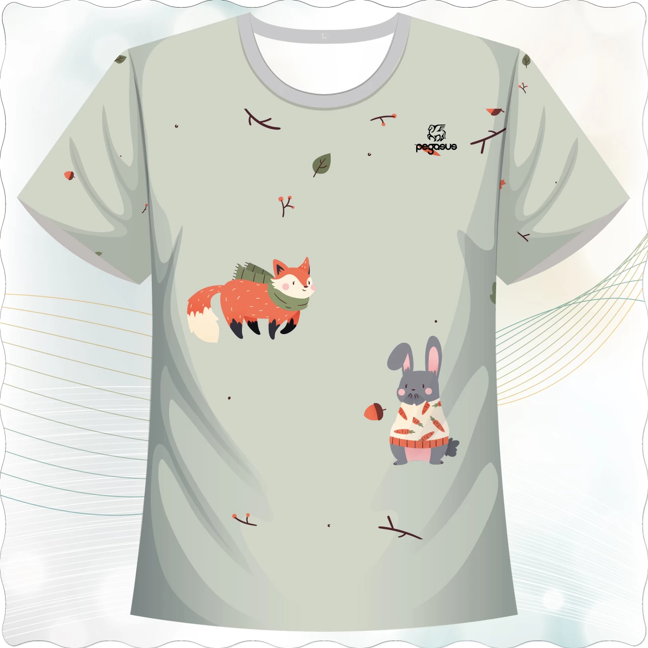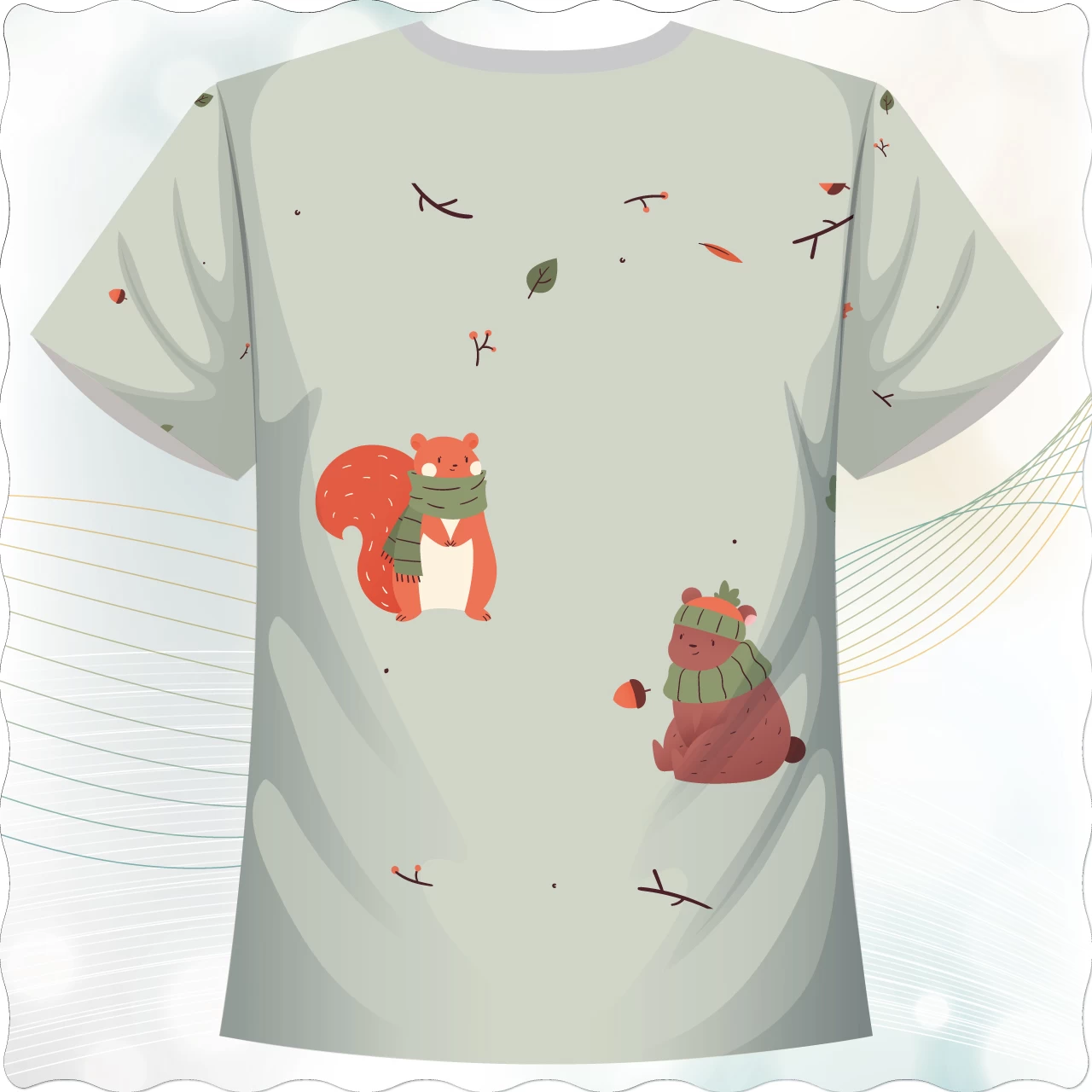 森林萌友款」,以 森林小動物 為主題,將狐狸、兔子、松鼠、熊等角色融入溫潤的淺綠色底色中,搭配圓點與樹葉枝條作點綴。每個小動物都穿戴著圍巾或毛衣,展現出秋冬的溫馨氛圍。正面設計的狐狸與小兔子可愛俏皮,背面則以松鼠與小熊延續故事感,讓整件衣服像是一幅完整的插畫。
