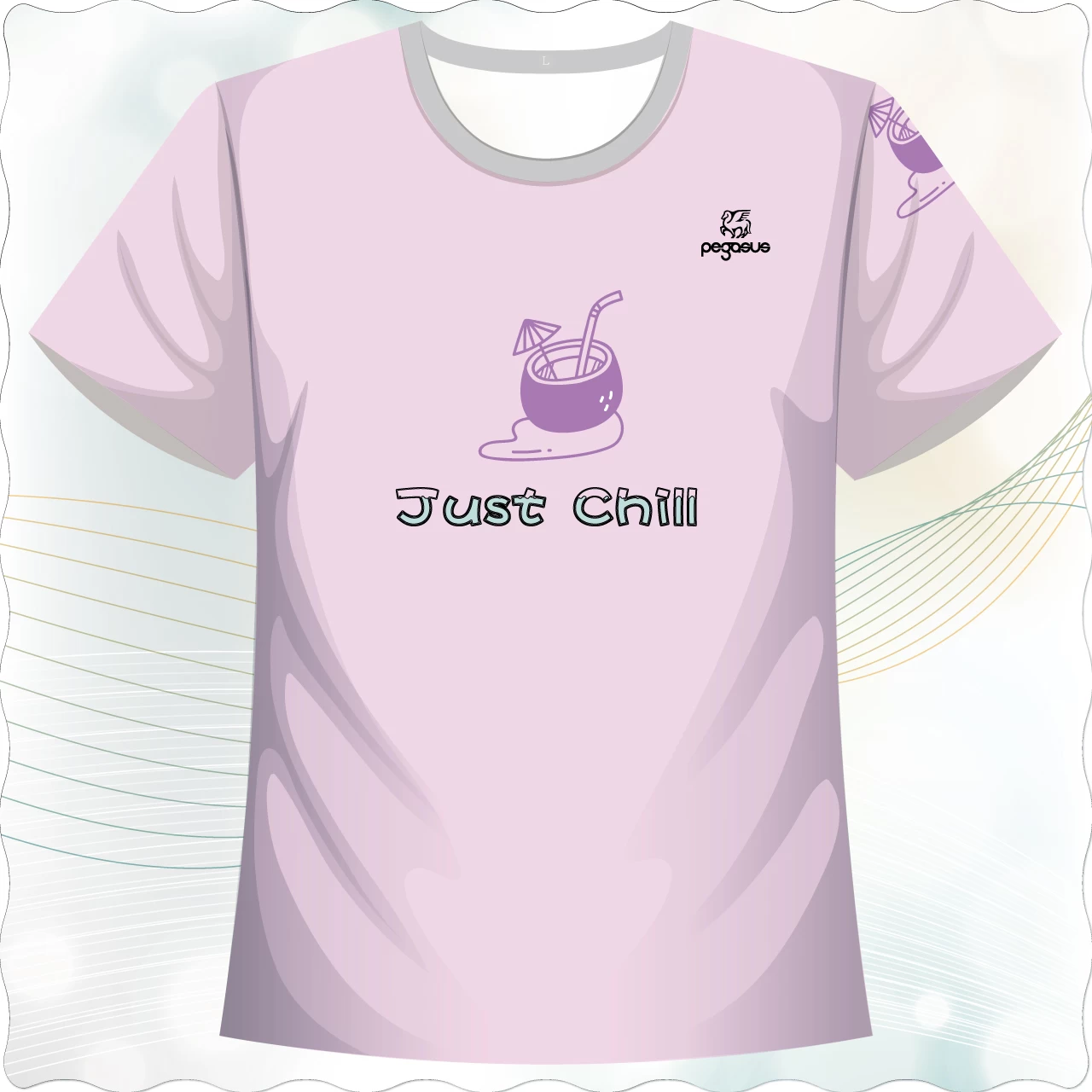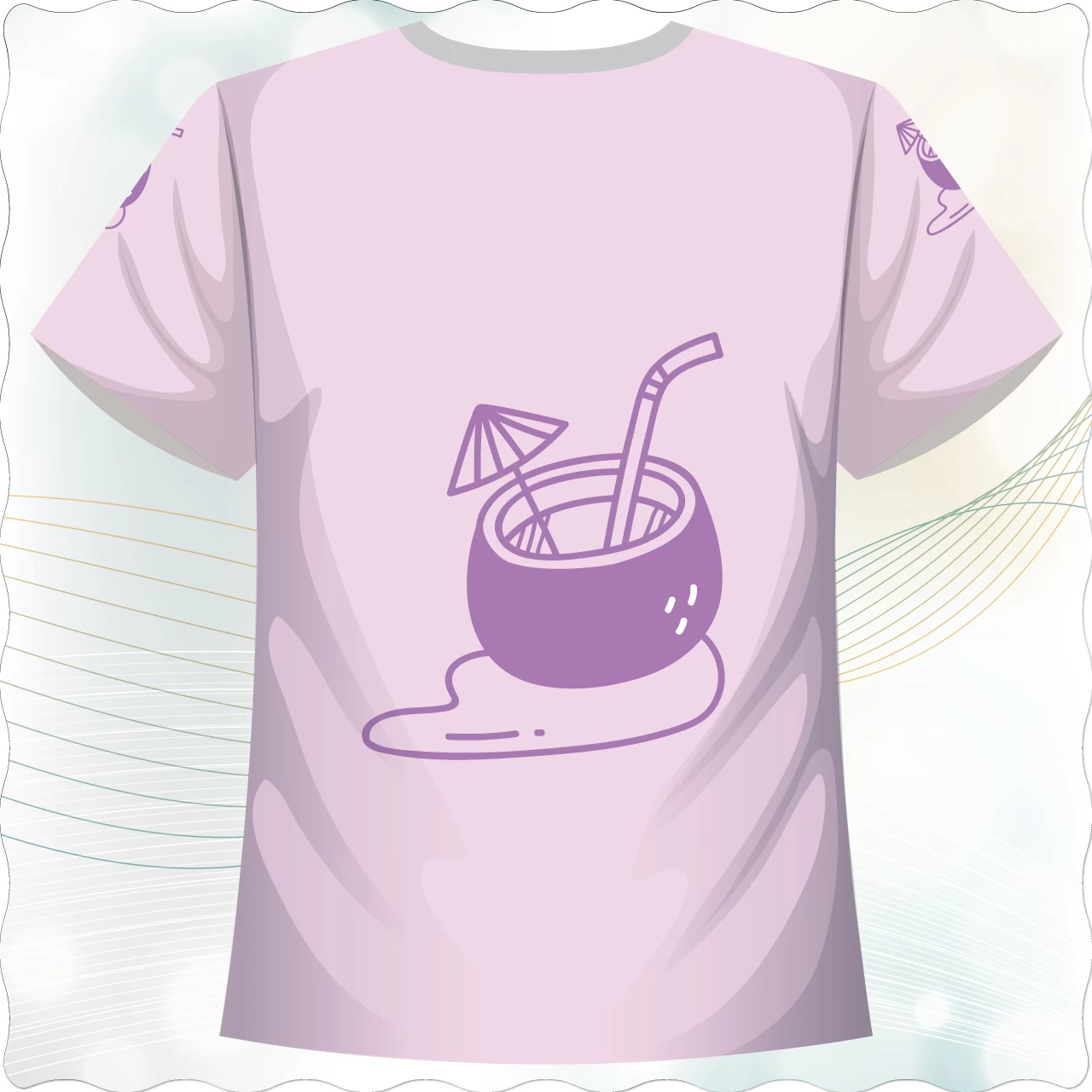 這款「椰夏微醺款」圓領T恤,正面以一顆椰子冰飲搭配吸管與陽傘,營造出夏日海灘度假感,背面則放大圖案呈現,視覺感更強烈。袖口也有延伸設計,整體活潑又一致,非常適合休閒穿搭、活動團服或飲料店品牌制服。