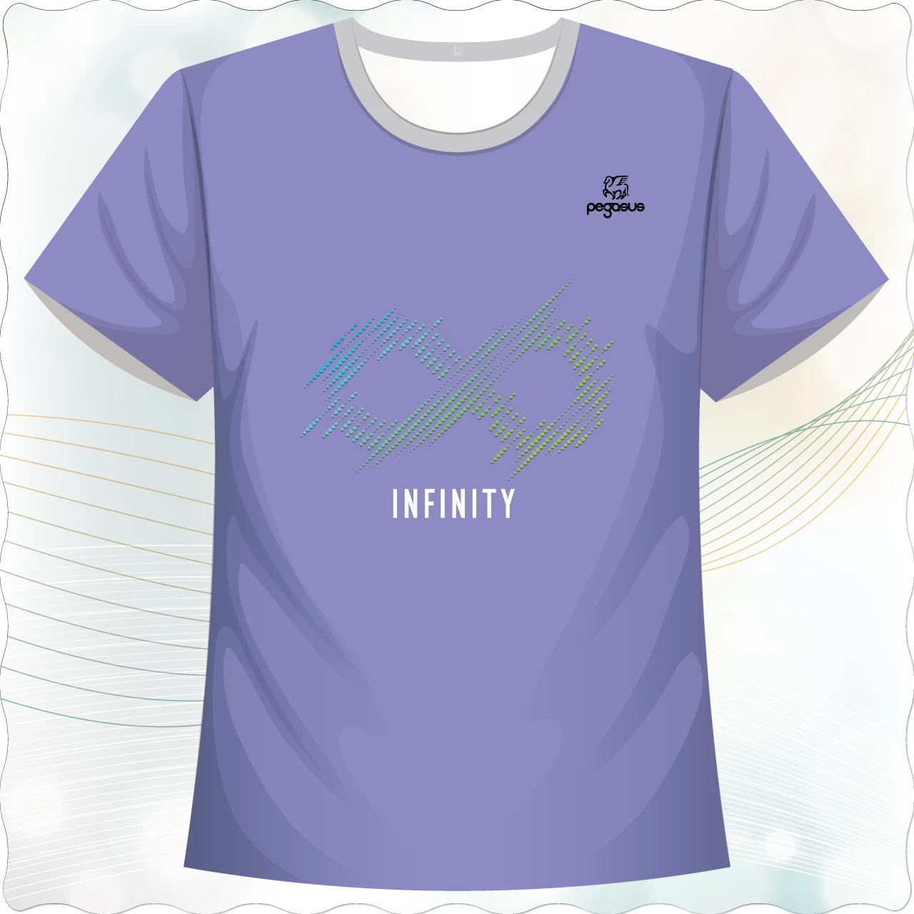 「無限之境款」,以 紫羅蘭底色 為基調的圓領T恤,正面採用簡潔卻極具力量的設計 —— 幾何像素感的「∞ 無限符號」,配合藍綠漸層的線條,展現出動感與未來感。搭配「INFINITY」字樣,整體風格低調卻不失張力,適合追求極簡又帶有意象深度的穿搭者。