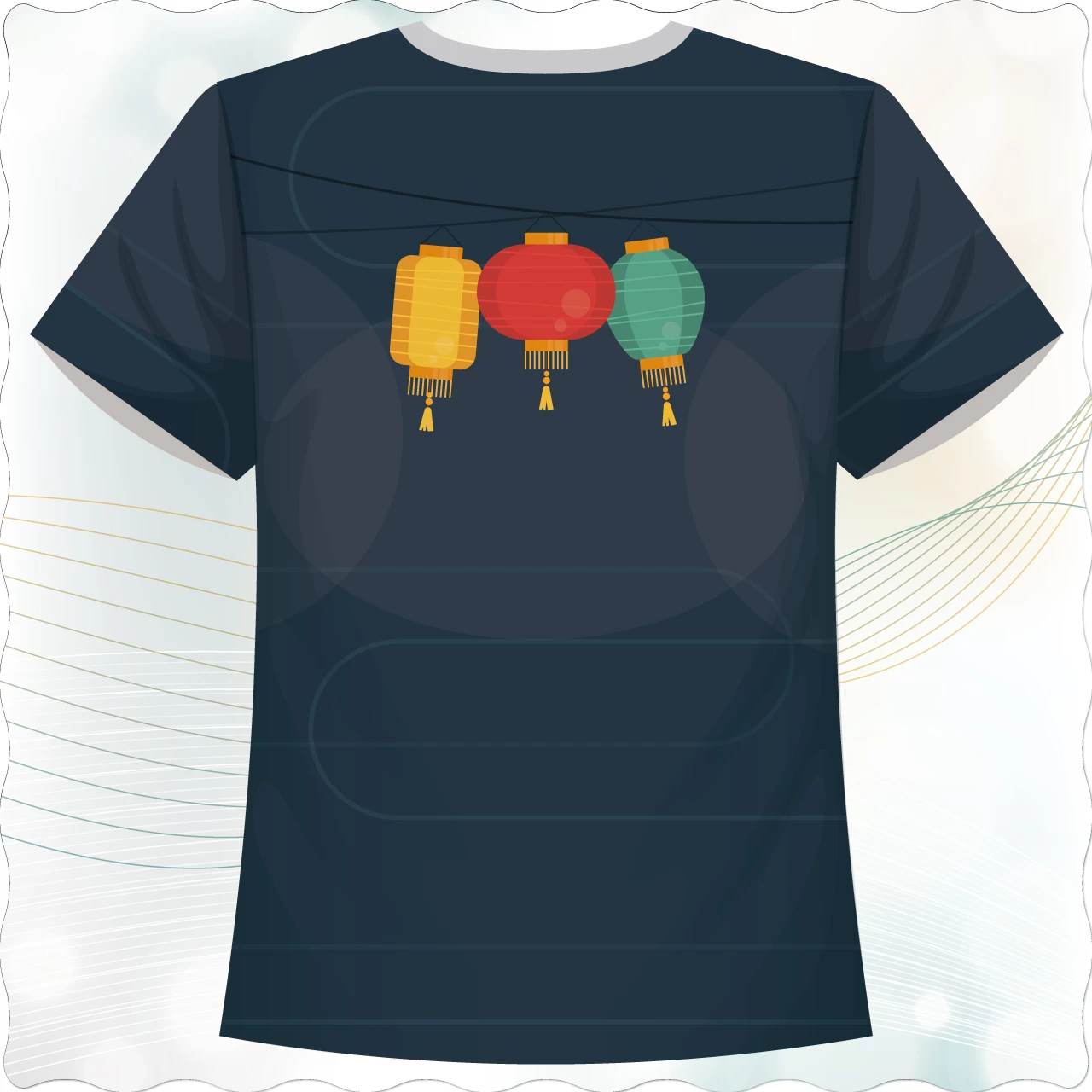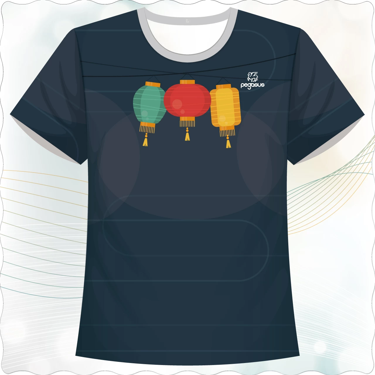「燈語圓舞款」,以深藍色布底搭配紅、綠、黃三色燈籠,營造出濃厚的節慶氛圍。燈籠以簡約插畫風格呈現,排列於胸前,帶來視覺上的重點與文化意象。背面同樣延續燈籠元素,對應前後設計,展現一致性。此款T-shirt適合中秋、元宵或年節相關活動穿著,亦可作為團體紀念服。整體風格簡約卻不失特色,將東方文化意象與現代服飾設計完美融合,展現獨特的客製化價值。
