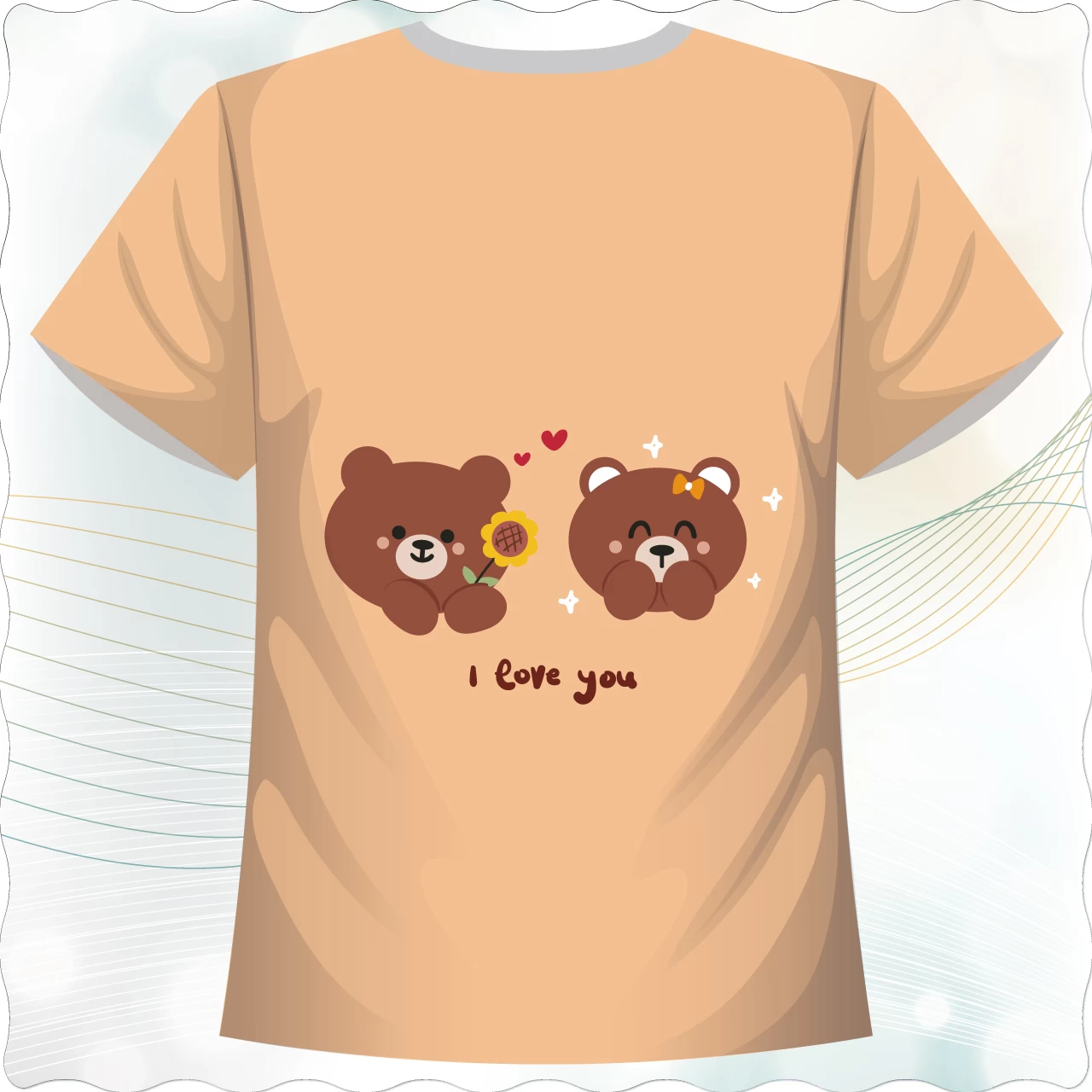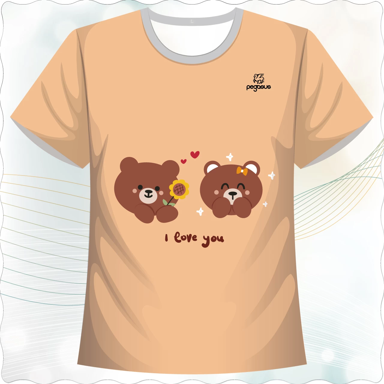 「甜心小熊款」這件圓領T採用溫暖的杏橘色為底,整體設計以可愛的卡通小熊作為主角,左側的小熊手捧一朵向日葵,露出害羞而真誠的表情;右側的小熊則臉上帶著笑容,眼神中充滿甜蜜與驚喜。胸前點綴著「I love you」字樣,傳遞著簡單卻真摯的愛意。