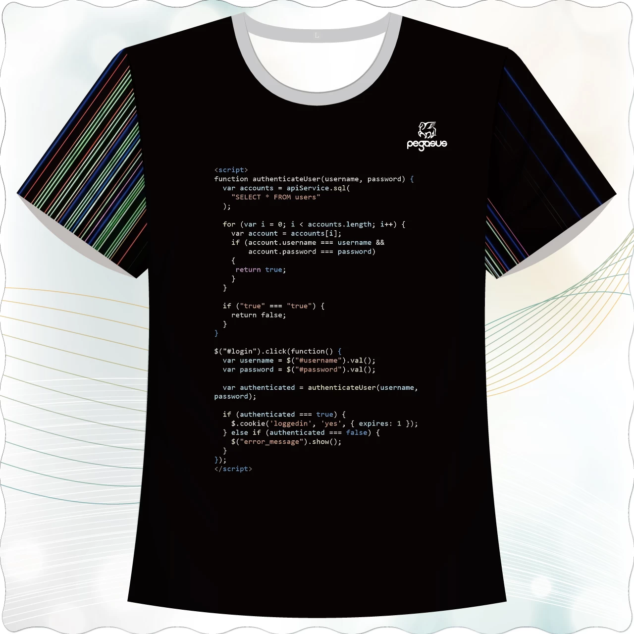 「程式異常」,前片印上完整的 JavaScript 登入驗證程式碼,搭配極簡的黑色底色與灰色領口,營造出濃厚的科技感與極客氛圍。袖子與背面設計靈感來自螢幕訊號錯位的彩色條紋效果,讓整體視覺呈現出「系統錯誤」的前衛感,既有數位科技的冰冷感,也帶著些許解構藝術的張力。此款適合喜愛程式設計、網路文化、科技潮流的穿搭族群,不論在展覽、駭客松活動或街頭日常,都能成為話題焦點