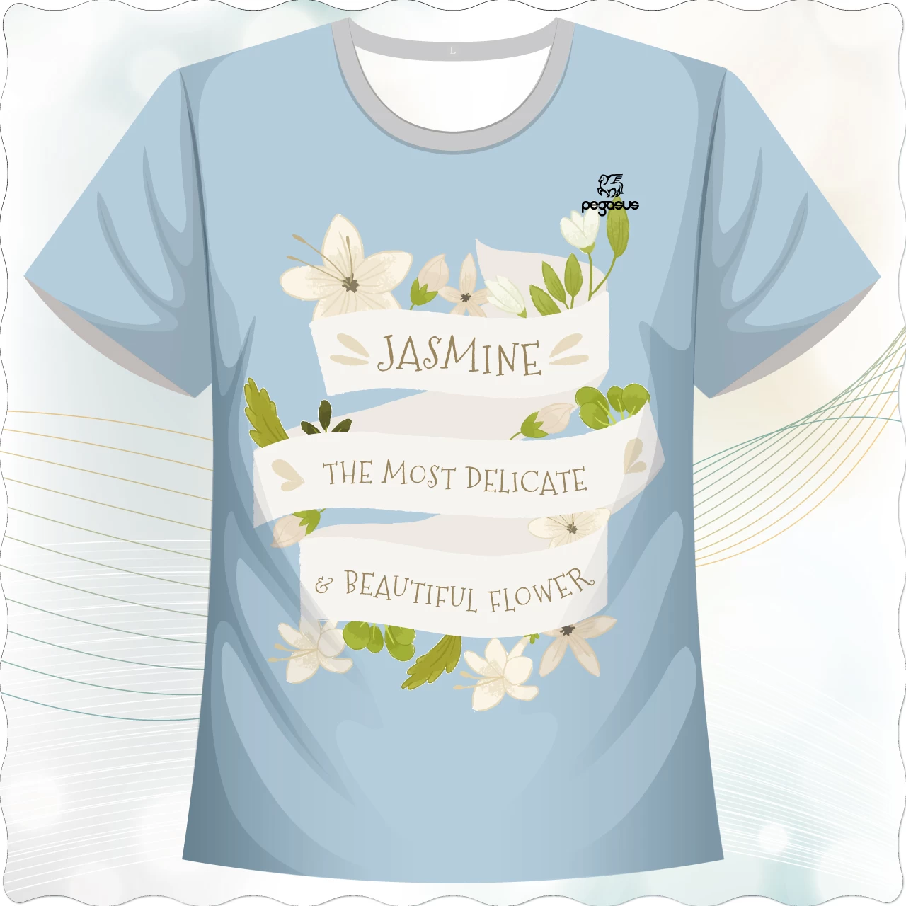 「茉莉心語款」,以 茉莉花 為設計主題,整體底色選用清新淡藍,給人舒心、溫柔的感受。正面以象徵茉莉花的插畫與花環為主視覺,搭配 「JASMINE – THE MOST DELICATE & BEAUTIFUL FLOWER」 的文字設計,營造出文藝與優雅的氛圍。背面則保留素雅的純色,呈現簡約乾淨的風格,讓正面的圖案更加突出。此款式特別適合 品牌週邊、花卉主題活動、文創團體制服,甚至可作為文青風格的日常穿搭。它不僅是一件衣服,更是一種生活美感的表達。