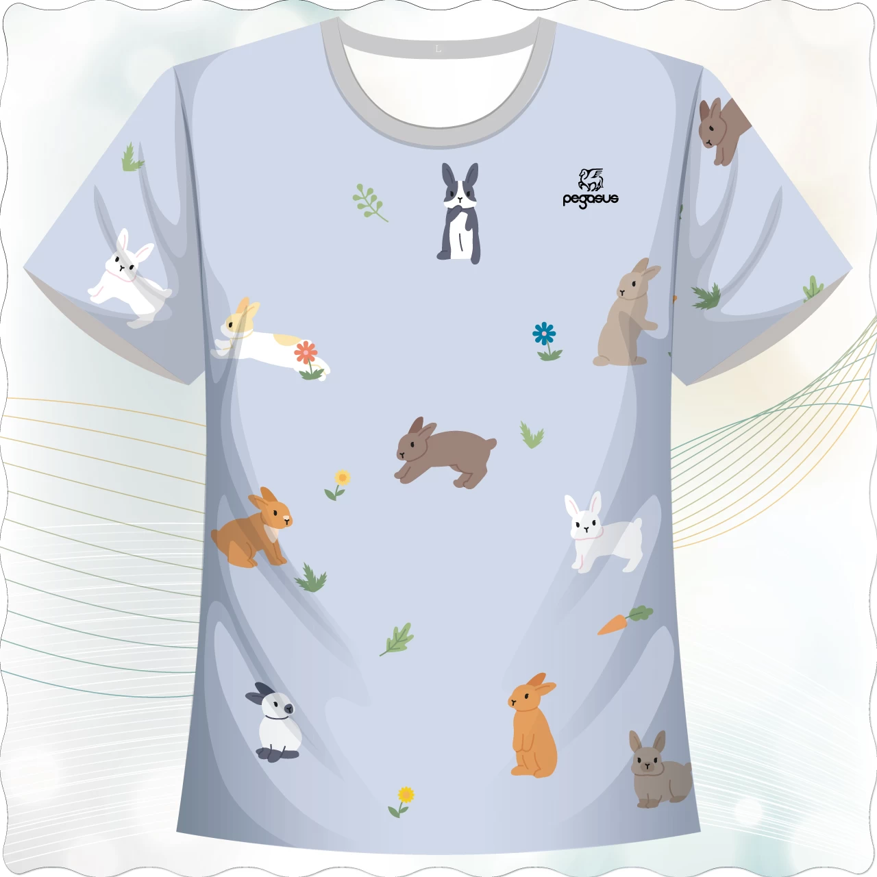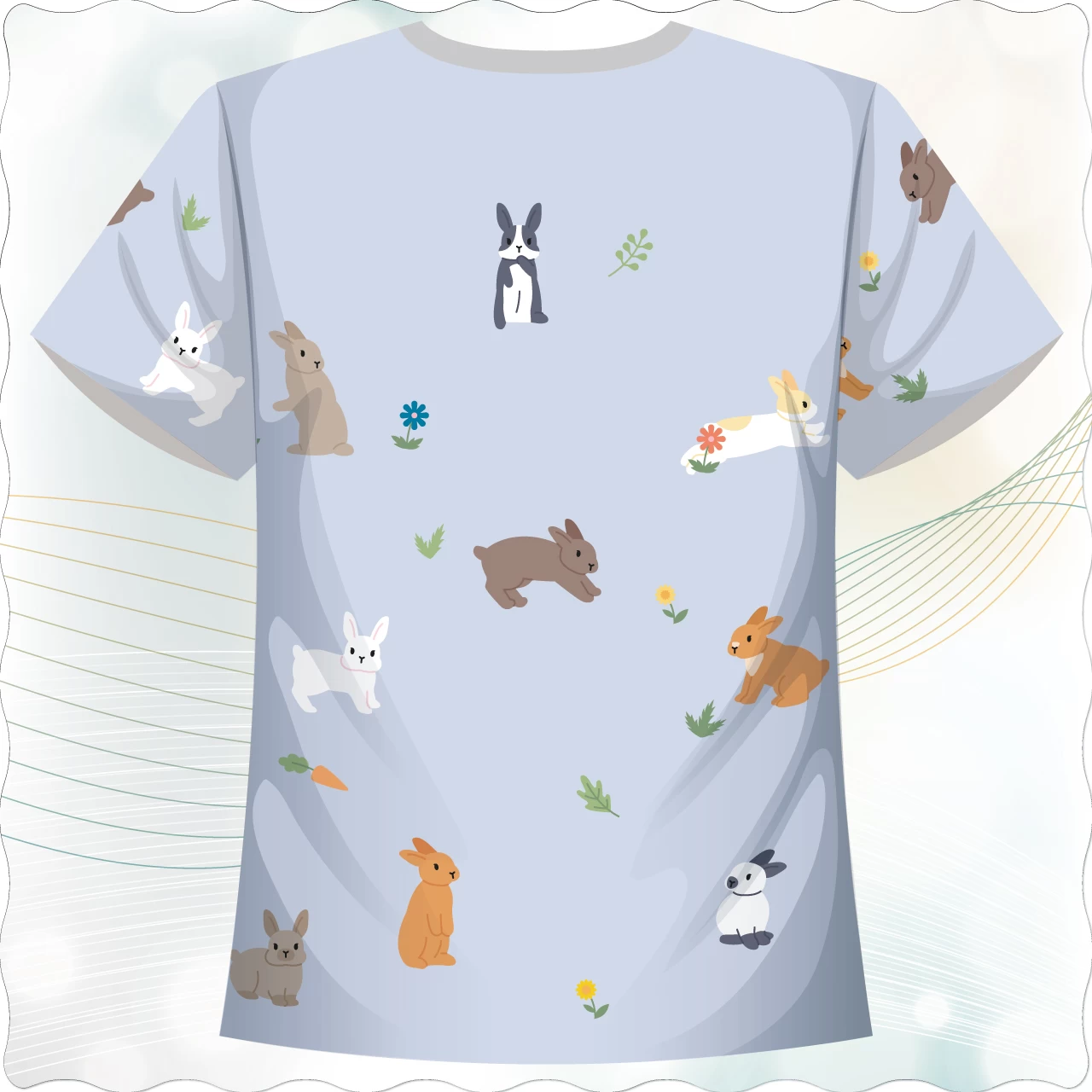 「草原萌兔款」,以柔和的淡藍色為底,點綴多隻姿態各異、神情可愛的小兔子,搭配花草與胡蘿蔔元素,呈現出清新自然的氛圍。插畫風格簡潔溫暖,讓整件衣服充滿療癒感與童趣,無論是日常休閒、外出踏青或親子穿搭,都能展現輕鬆愉快的生活品味。全幅印製技術確保圖案細節鮮明且色彩飽和,結合舒適透氣的布料,兼具視覺美感與穿著體驗,是喜愛小動物與自然風格人士的理想選擇。