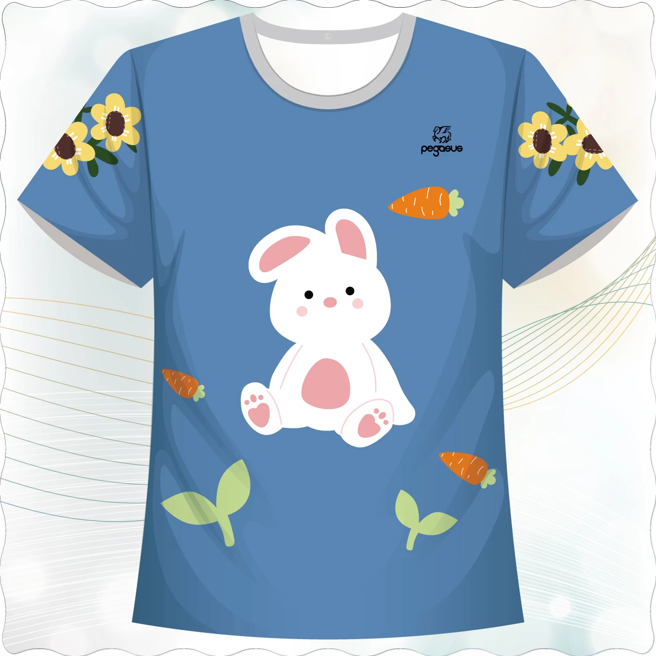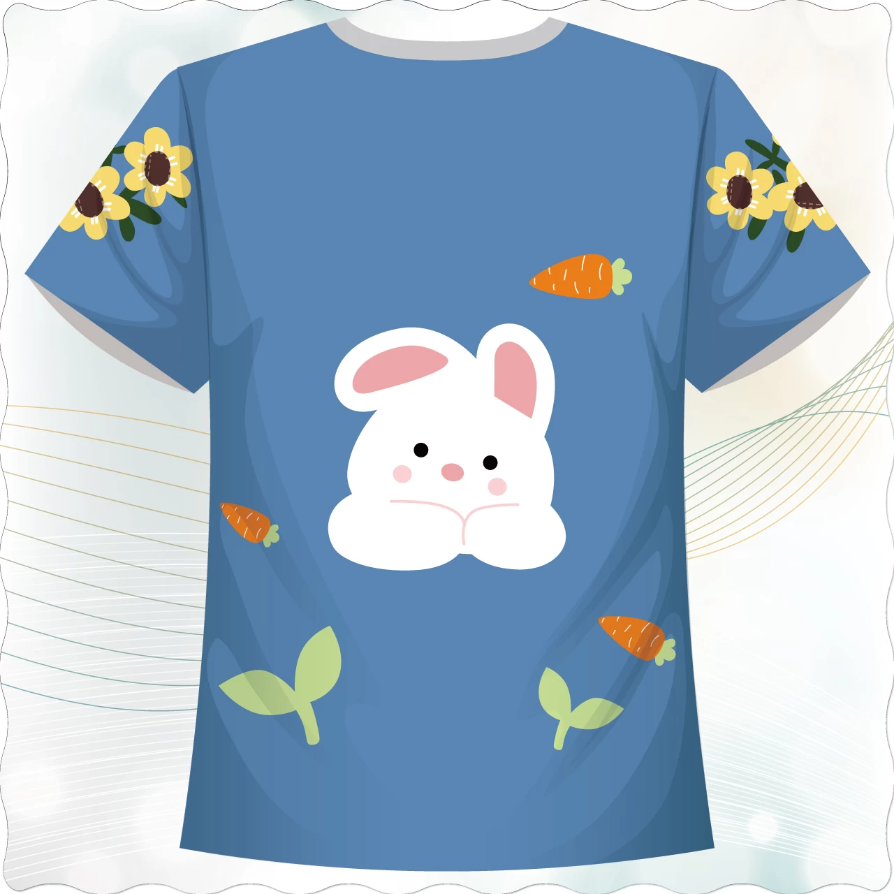 「萌兔田園款」,以可愛兔子為主角,搭配胡蘿蔔與綠葉元素,呈現出滿滿的自然田園氛圍。前後的兔子表情設計各有不同,正面展現天真可愛,背面則多了幾分俏皮,讓穿著者不論從哪個角度看都充滿童趣。袖口特別加入向日葵點綴,與整體藍色底色相呼應,營造清新明亮的視覺效果。
