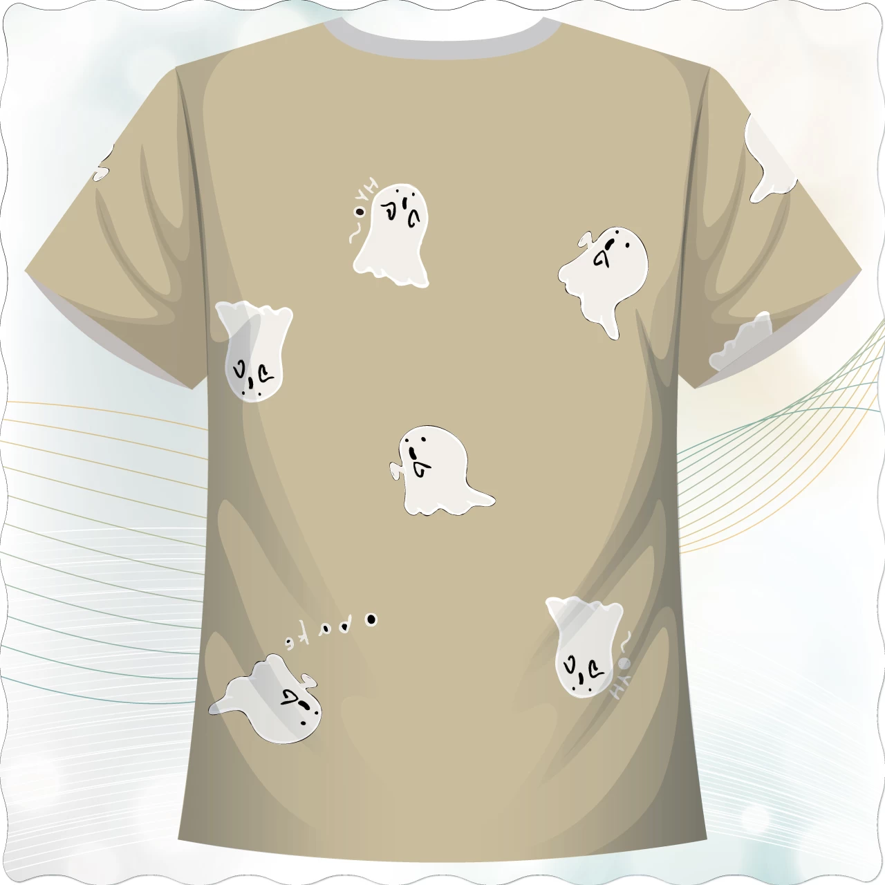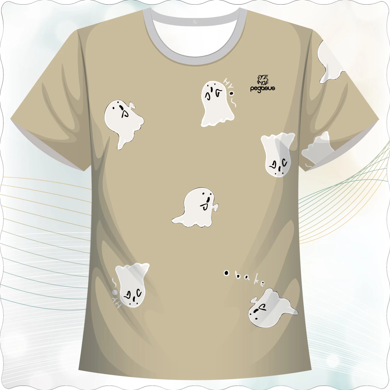 「萌鬼漂漂款」以卡其色為底,佈滿可愛逗趣的小幽靈插畫,營造出輕鬆俏皮的氛圍。每一隻幽靈表情各異,有的害羞、有的好奇、有的呆萌,並搭配「obake」與手繪文字點綴,讓整體設計更加生動。全版面印刷呈現高飽和度色彩與細膩線條,搭配舒適透氣的布料,適合喜歡日系插畫風格、幽默感與可愛元素的族群穿搭。不論日常休閒、聚會出遊,還是作為萬聖節的趣味服飾,都能讓你成為全場焦點