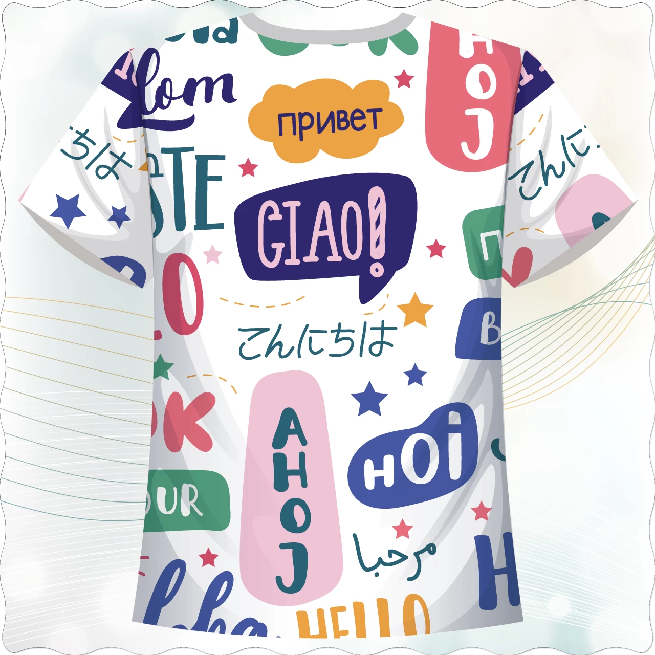 整體設計象徵文化交流與多元共融,將世界語言轉化為視覺藝術,呈現出開朗、歡樂又富有國際感的風格,非常適合語言教學活動、國際志工、文化節慶、觀光推廣等主題穿著,也能成為親子或團體裝的亮眼選擇。