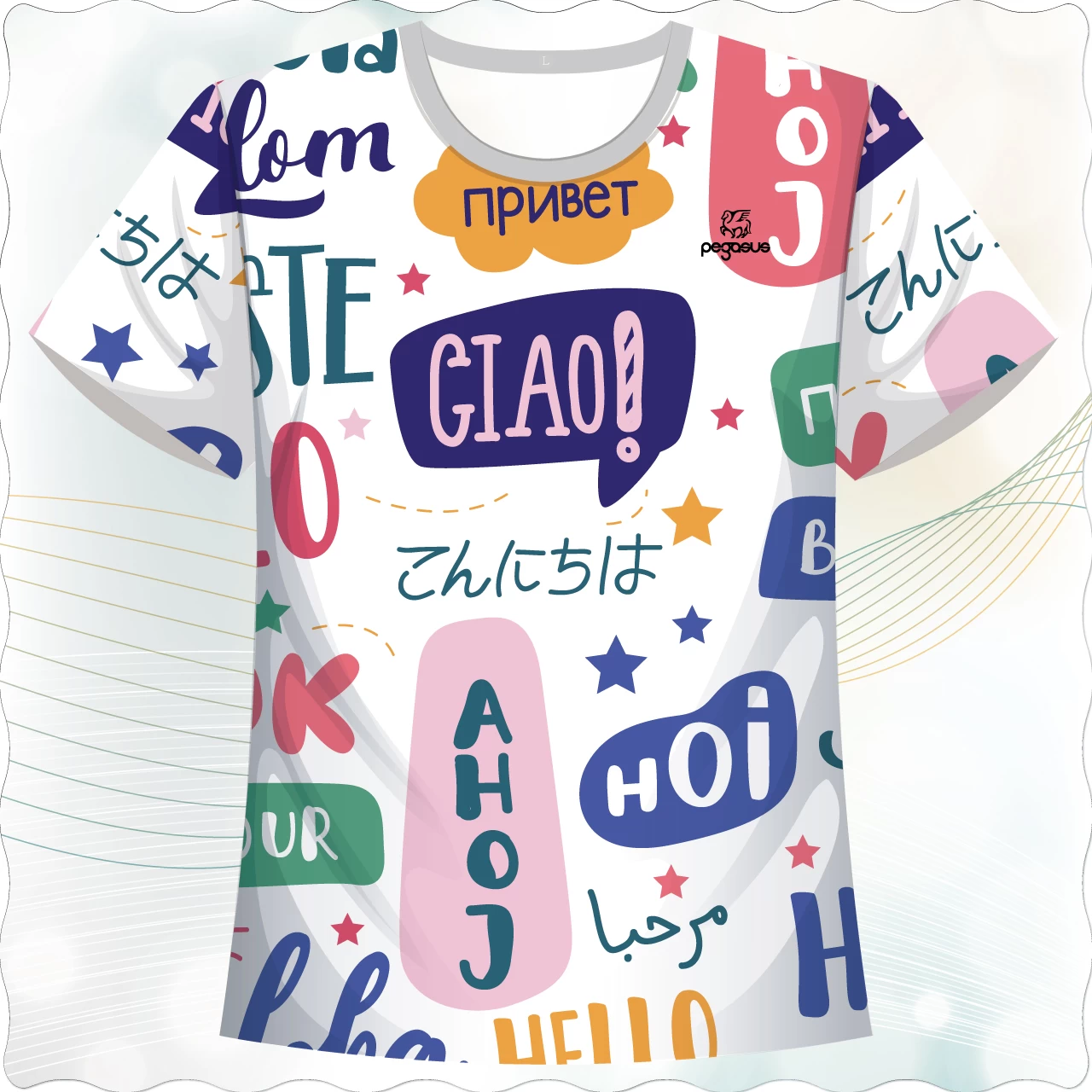 「萬語千言款」,以純白為底,滿版佈滿來自世界各地的「你好」問候語,包含英語、日語、俄語、阿拉伯語、法語、西班牙語等,並搭配繽紛的色塊、星星與氣泡對話框元素,創造出熱鬧活潑的視覺效果。