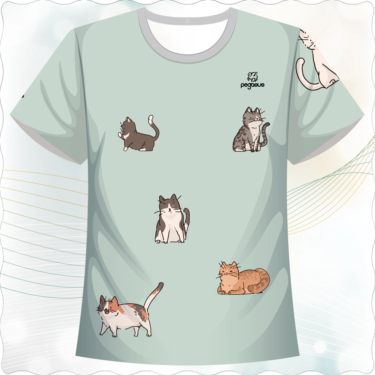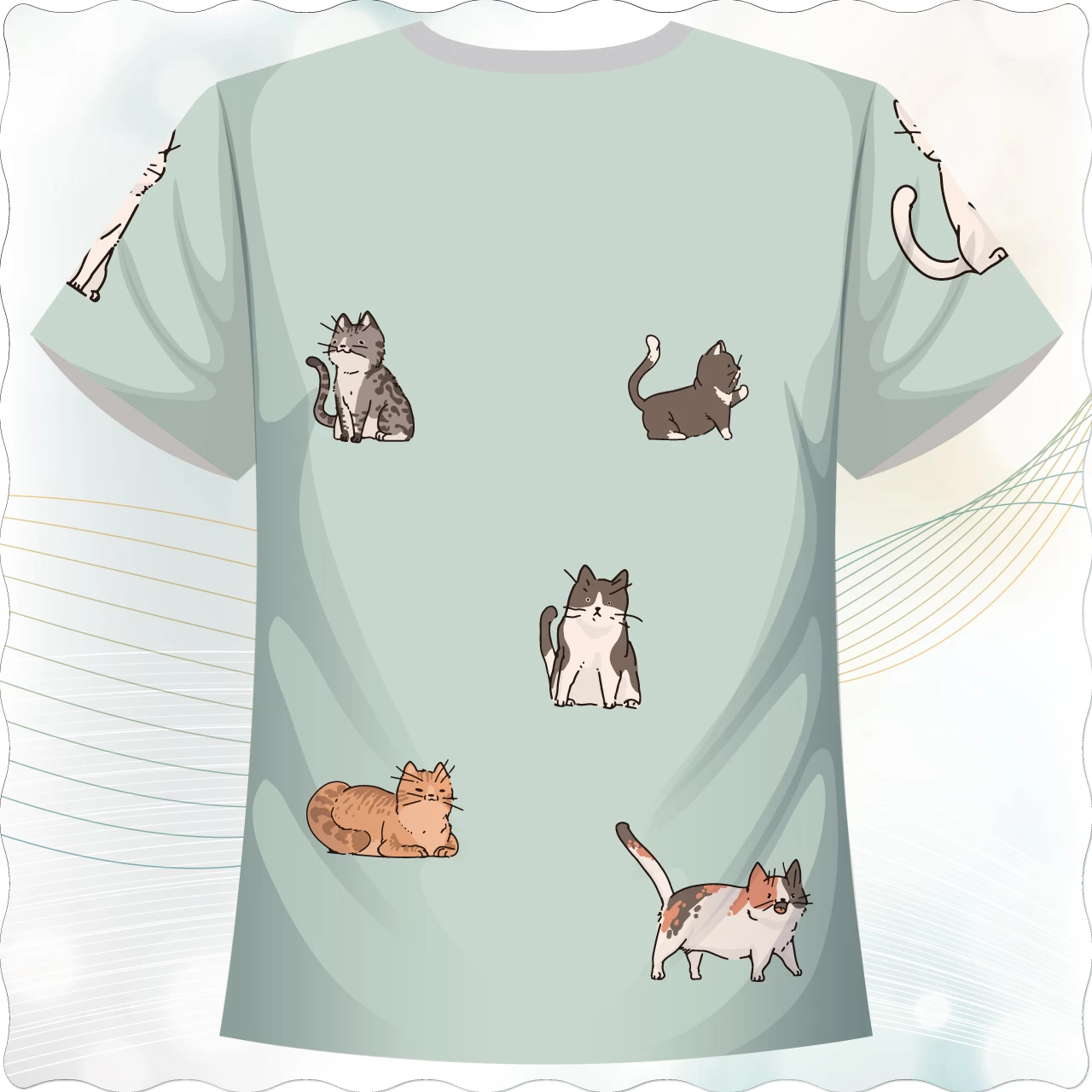 貓咪散步款,這款T恤以溫柔的馬卡龍綠為底,搭配多隻以手繪插畫風呈現的貓咪散步姿態。貓咪們以各種慵懶又可愛的動作,散落在衣服的正反面與袖口上,像是在你的日常中偷溜出來散步、撒嬌,帶來療癒又逗趣的視覺感受。每隻貓都像有靈魂,蹦蹦跳跳在布面上,也讓整件T恤充滿活潑與靈氣。適合喜歡自然、輕鬆穿搭與貓咪元素的族群。