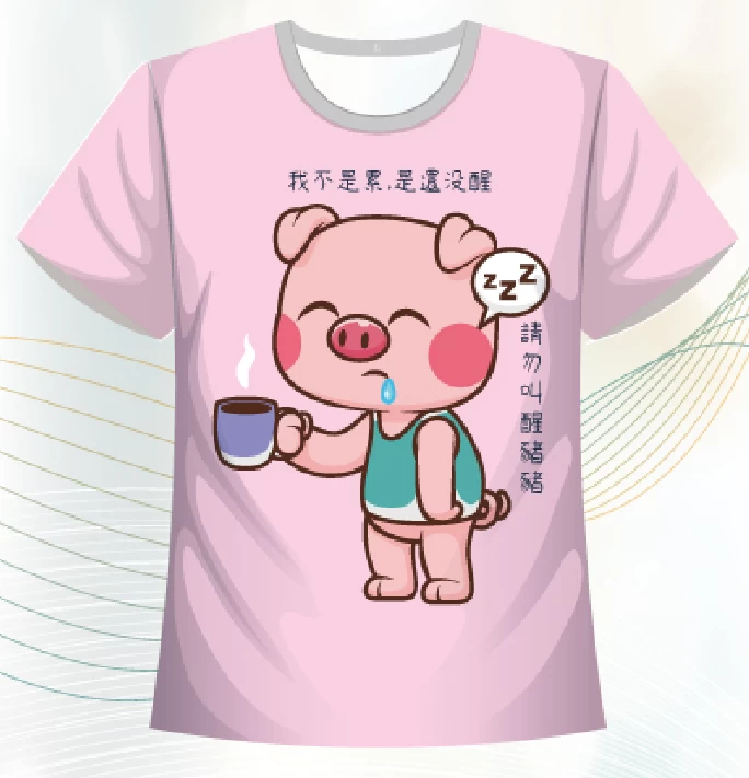這件T-shirt以柔和的粉色為底,正中央印有一隻可愛的粉紅色卡通豬,穿著綠色圍裙,手持一杯熱飲。豬的周圍有中文文字,增加趣味與溫馨感。整體設計風格輕鬆俏皮,色彩柔和,適合喜歡可愛風格與溫暖氛圍的穿搭者,展現親切與愉快的個性。