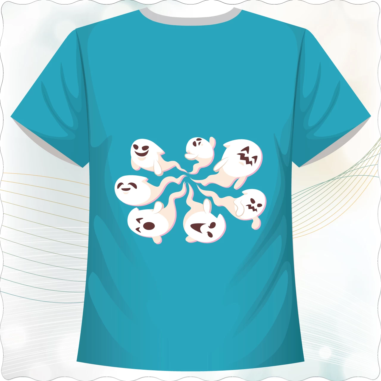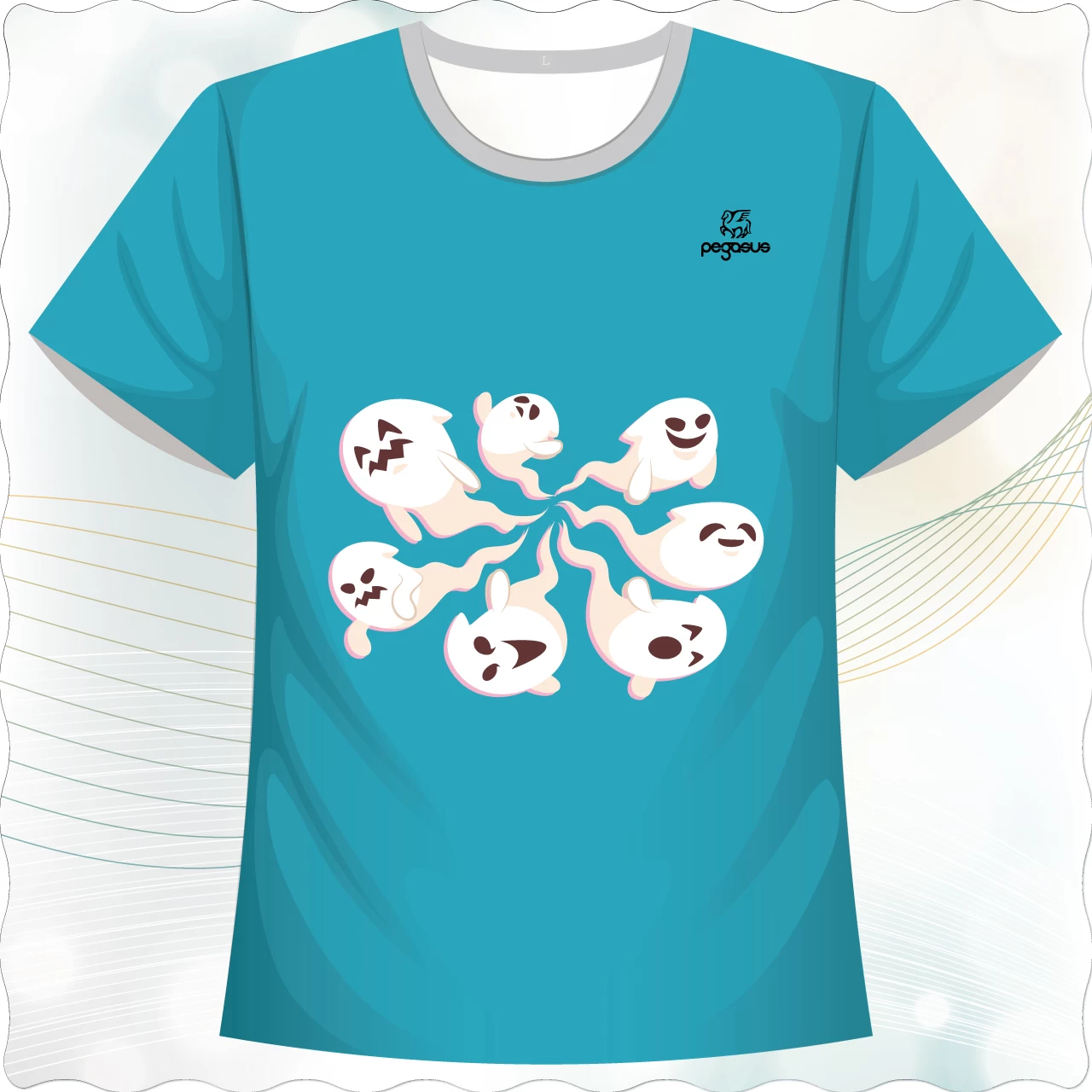 「鬼靈派對款」,這款客製化圓領T以亮眼的湖水藍為底色,中央印製六隻表情各異的小幽靈,圍繞成圈,如同在夜空中開心起舞。設計風格帶有卡通Q版元素,將萬聖節的神祕氛圍轉化為輕鬆幽默的趣味感,既可愛又帶點小惡作劇的味道。